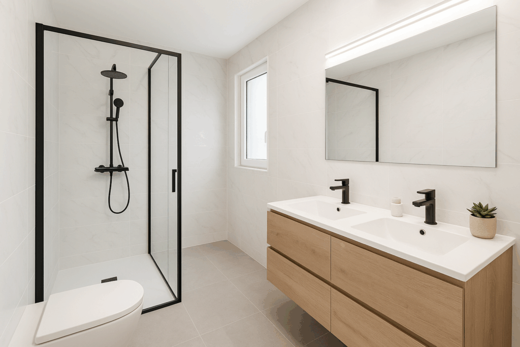 Notre client souhaitait moderniser une salle de bain vieillissante datant des années 90. L’objectif était de créer un espace plus lumineux, fonctionnel et facile d’entretien, tout en optimisant la surface disponible (6 m² seulement).